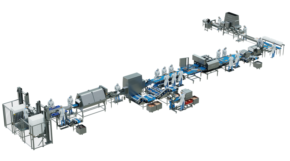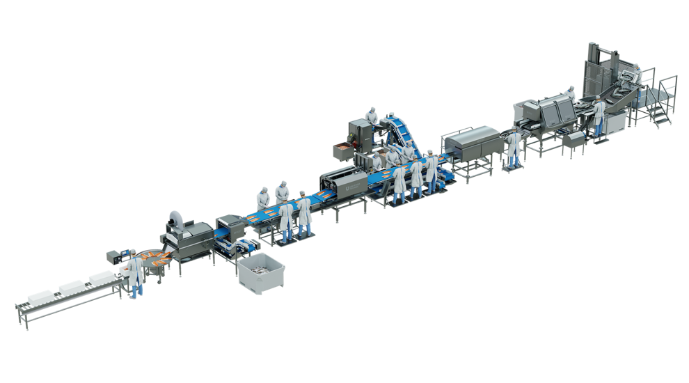 Flexible processing line with dual column loaders and automated packing - up to 40 fillets/min